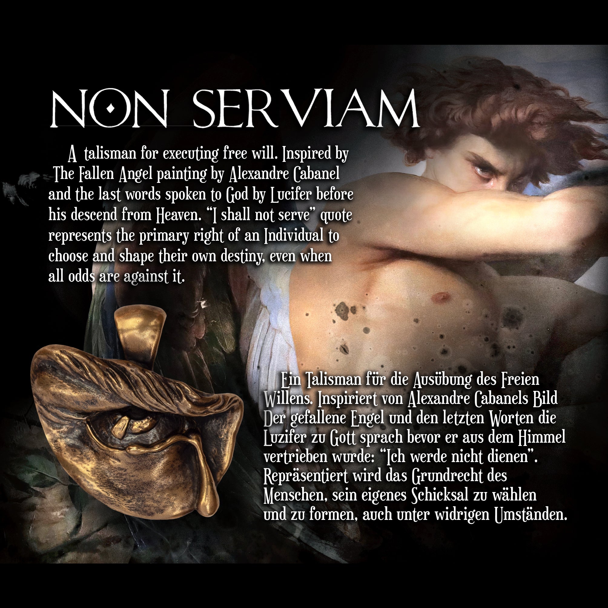 A motif inspired by Alexandre Cabanel's Fallen Angel painting depicting Lucifer exiled from Heaven.